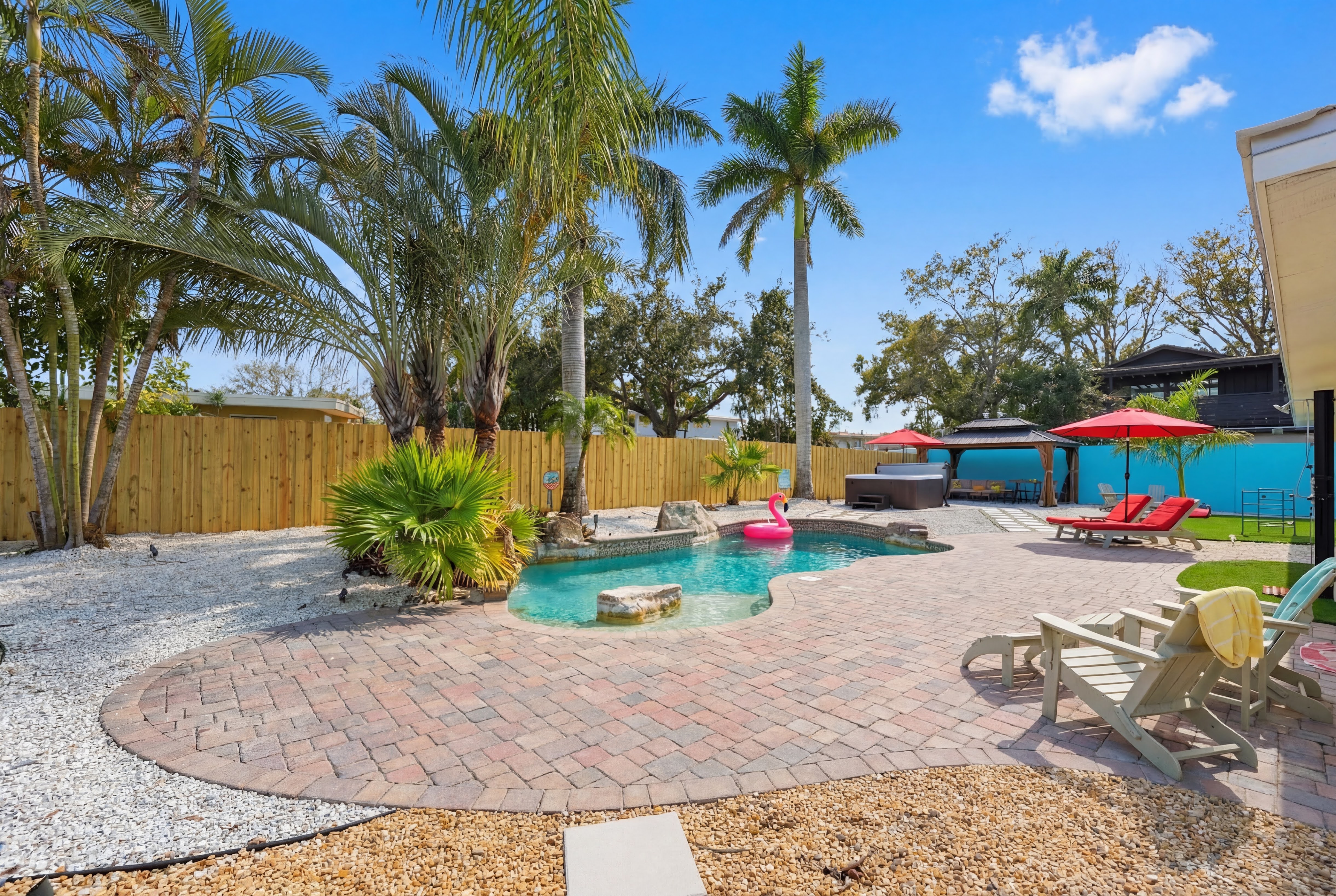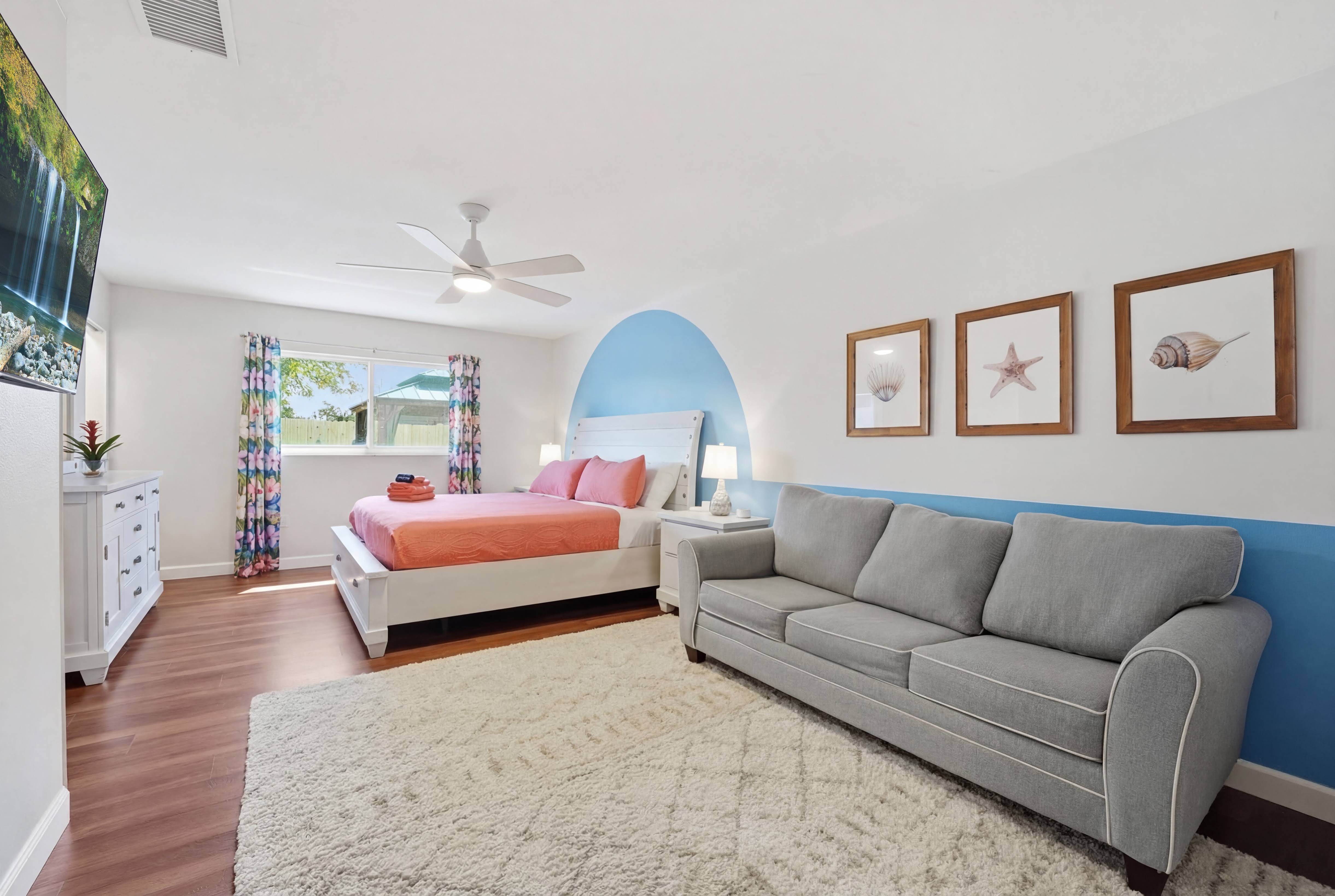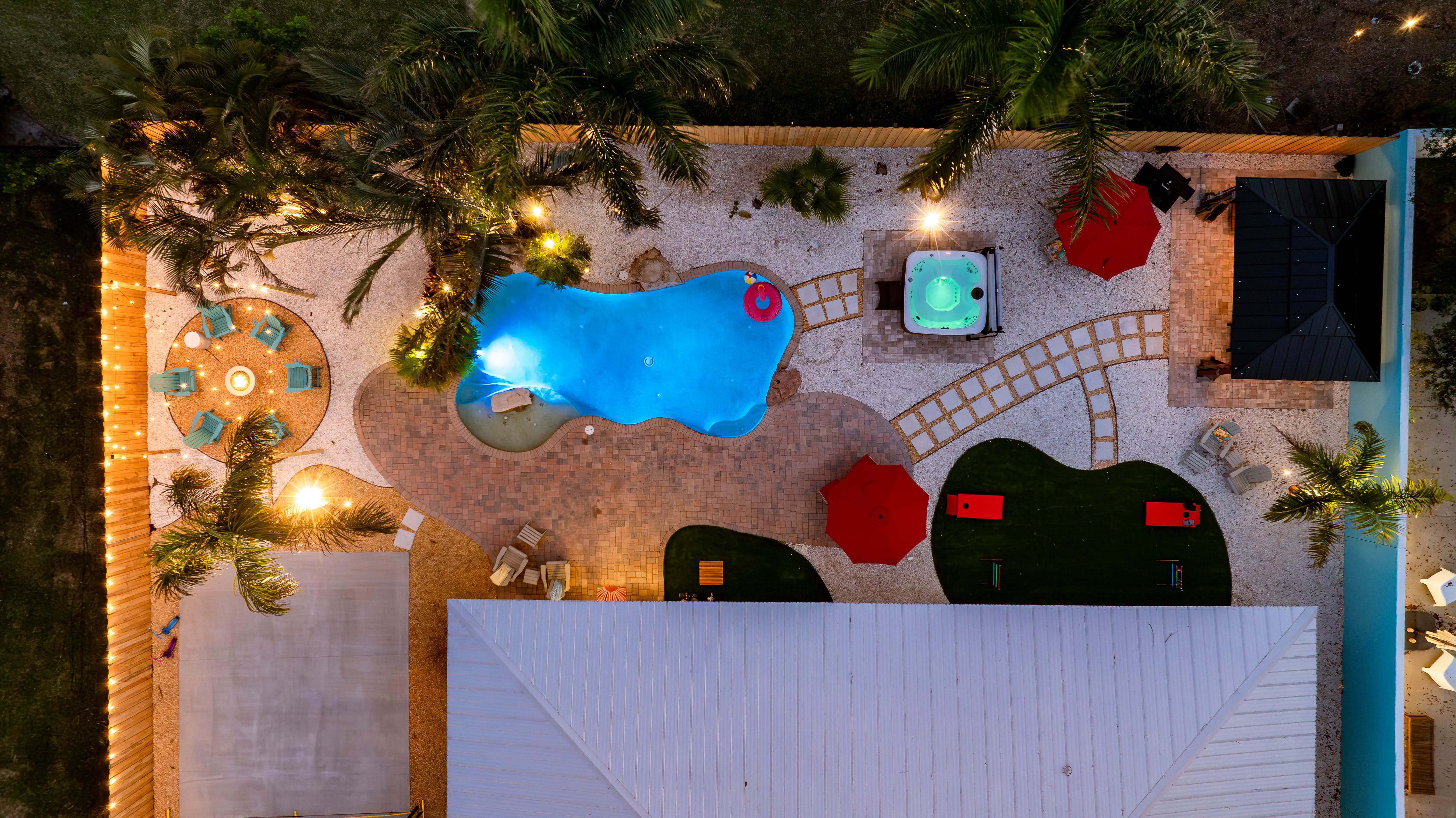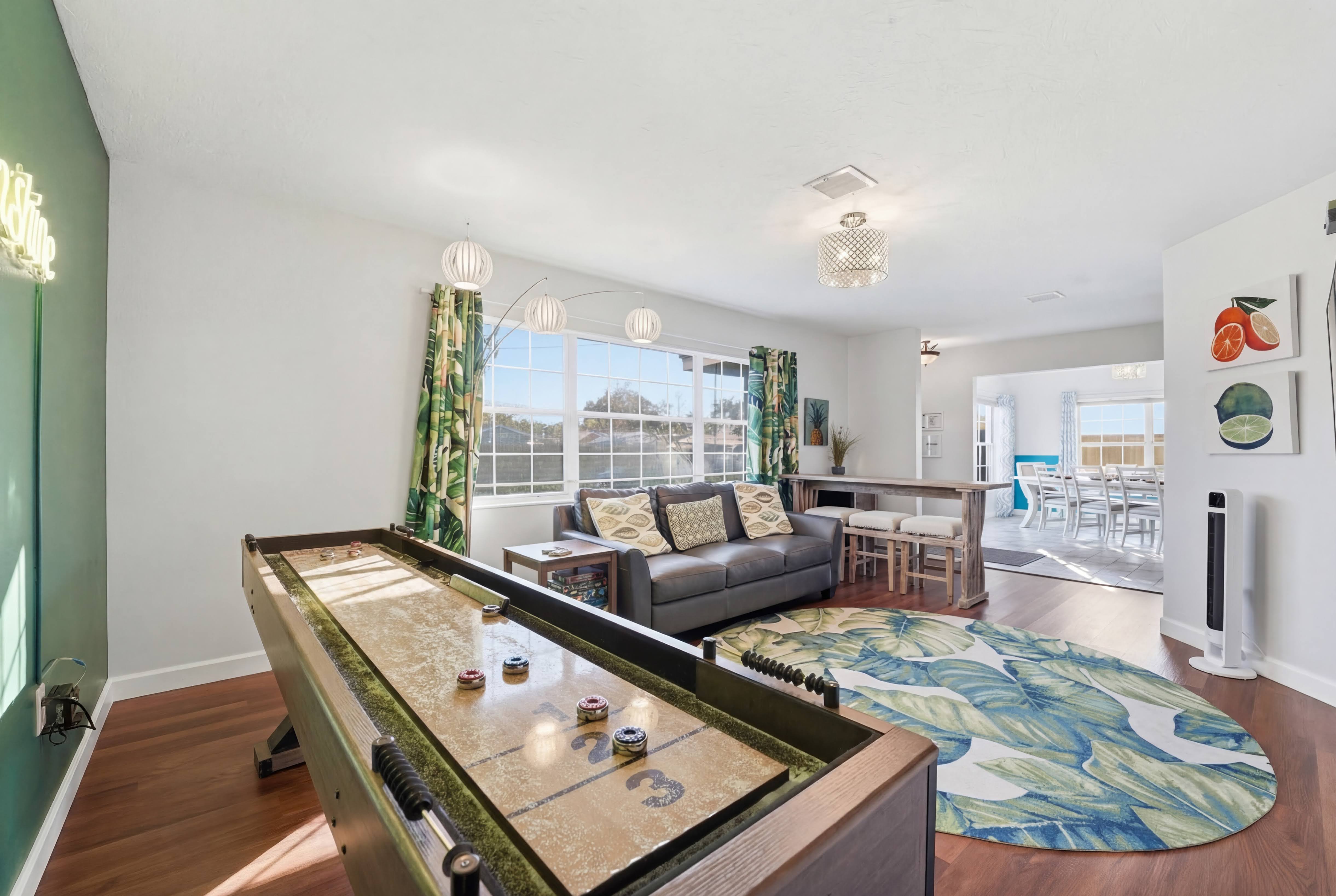 KEY FEATURES: ☀ Heated pool w/waterfall + hot tub + fancy foam pool floats + pool noodles + kids life jackets ☀ Pickle ball 20' x 44' court + basketball court + fire pit + grill (BYO charcoal) ☀ Cornhole + ladder game + giant yard pong + gazebo + twinkle lights ☀ 6 beach chairs + 2 beach umbrellas + small backpack cooler for beach trips ☀ Game room with old-school Nintendo gaming system + shuffleboard table + board games + drink fridge ☀ Large primary bedroom w/luxurious King bed + pullout couch/seating + Roku TV + en-suite bathroom ☀ Dining room seats 8 comfortably ☀ Extra large kitchen + island seating + Keurig + coffee pods + kitchen basics ☀ Family room w/65" Roku TV + soundbar ☀ Spacious 2,200+ sq ft home for large groups ☀ Family friendly items: sound machines in every bedroom + high chair + pack 'n play + scooters + some toys for little ones + kid-friendly cups and plates *Please note that the pickle ball court will be painted in the near future but is not painted yet*