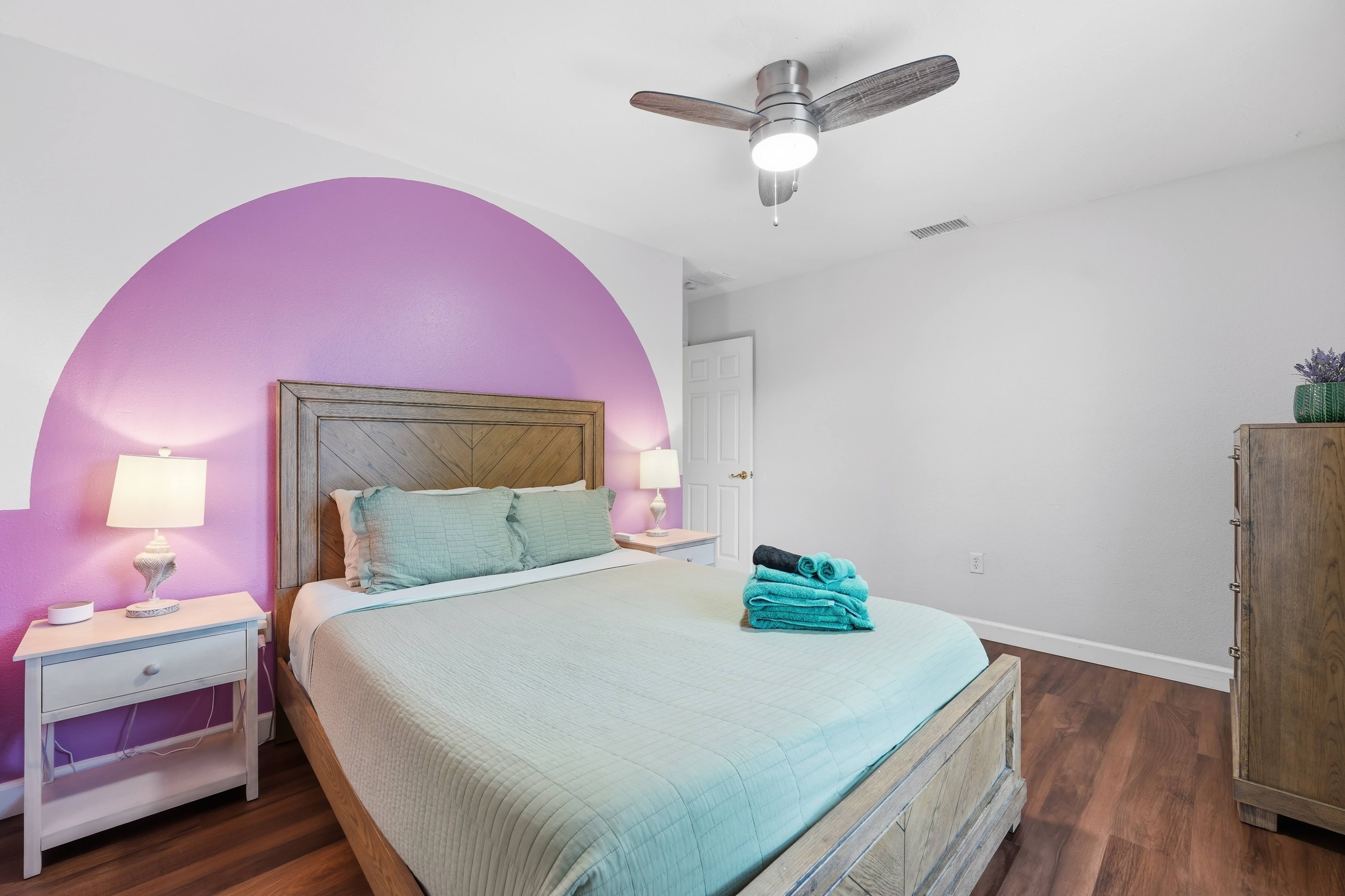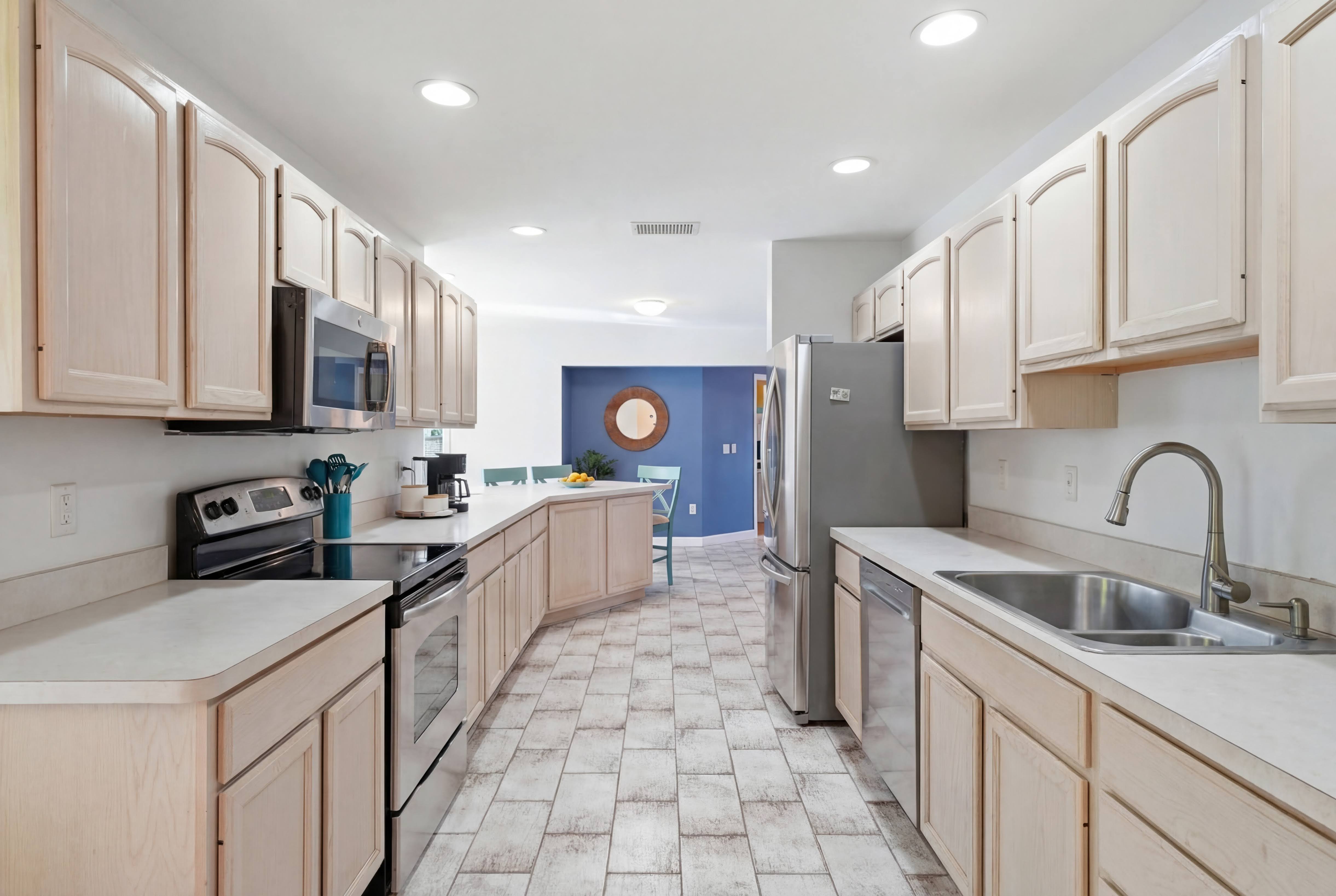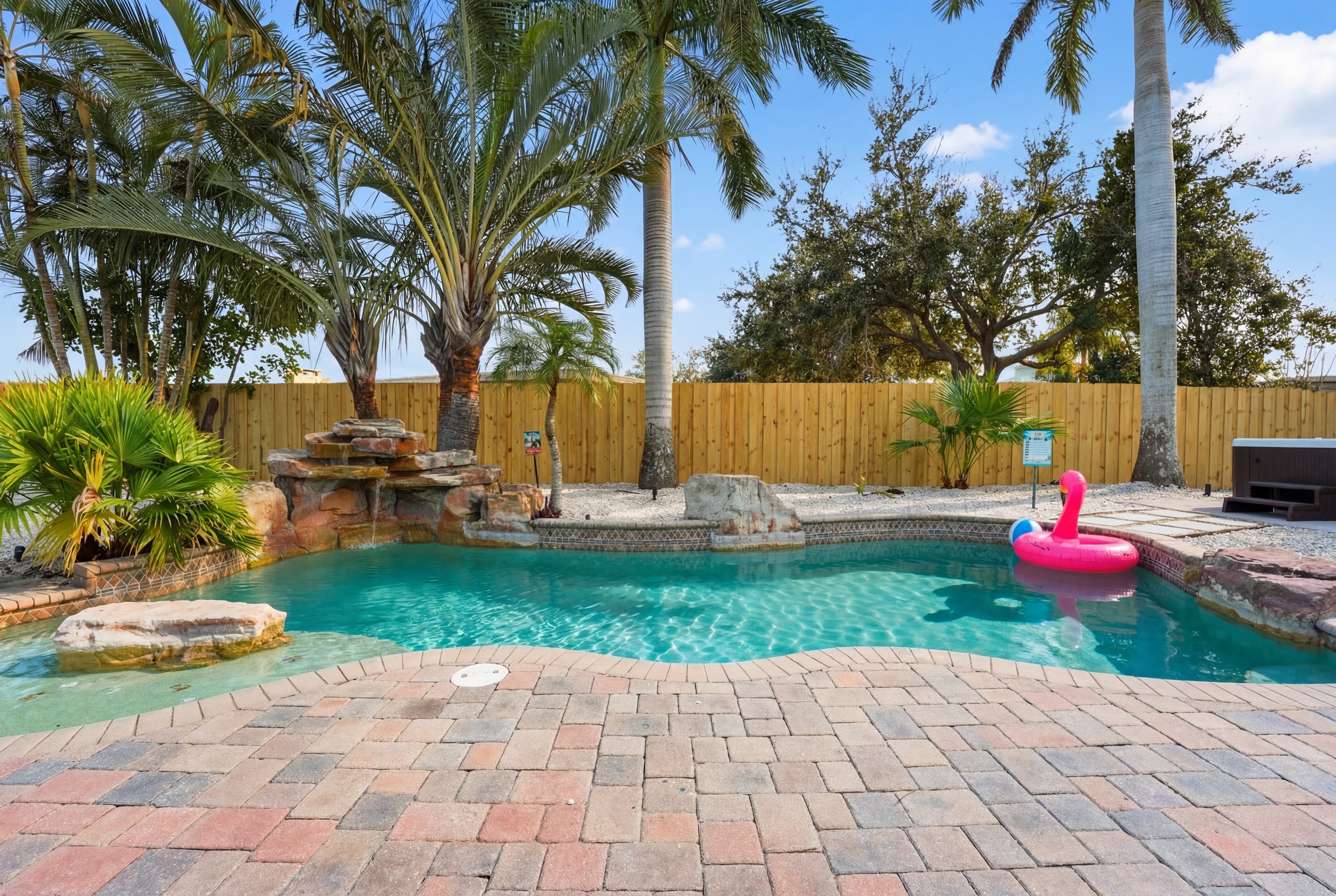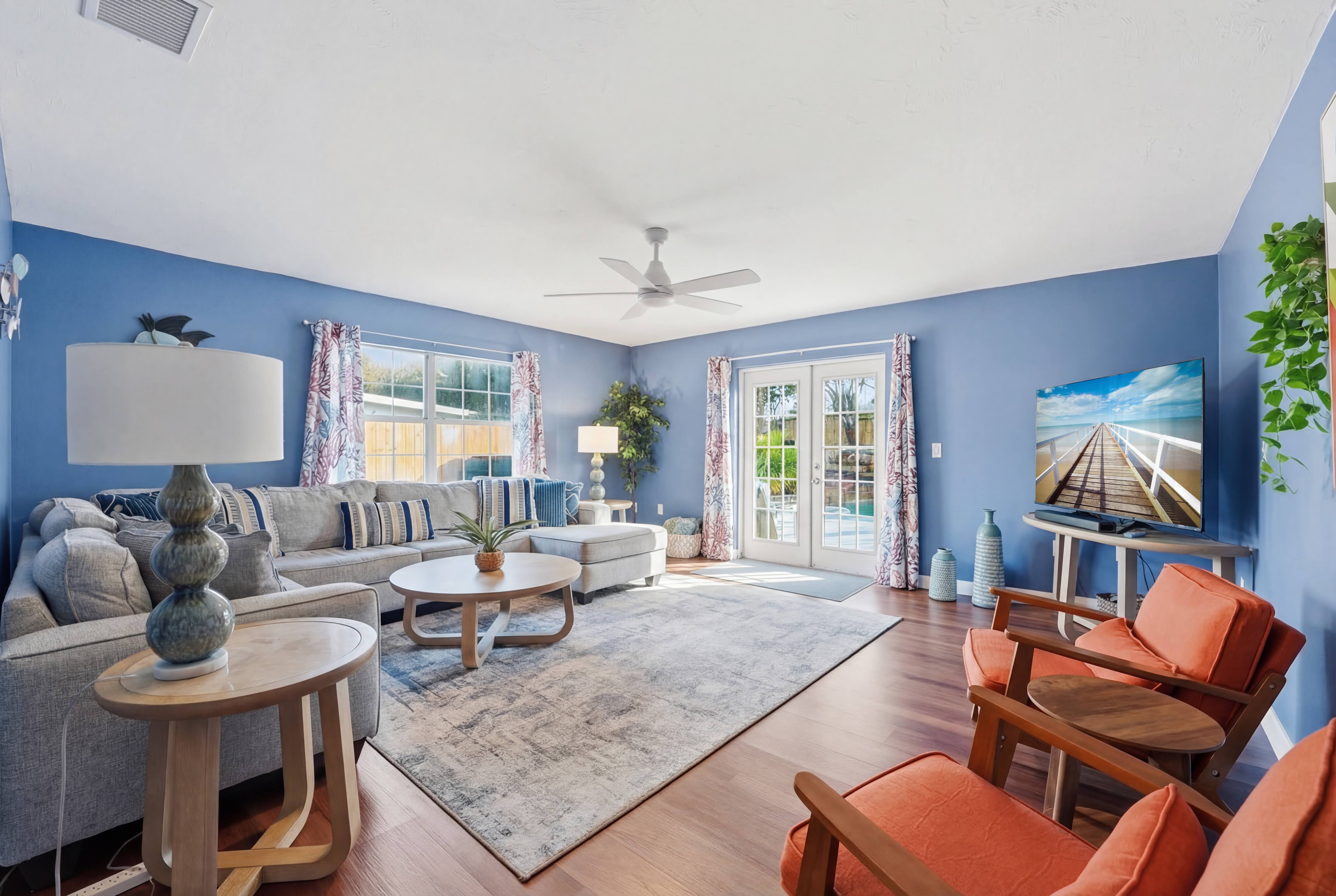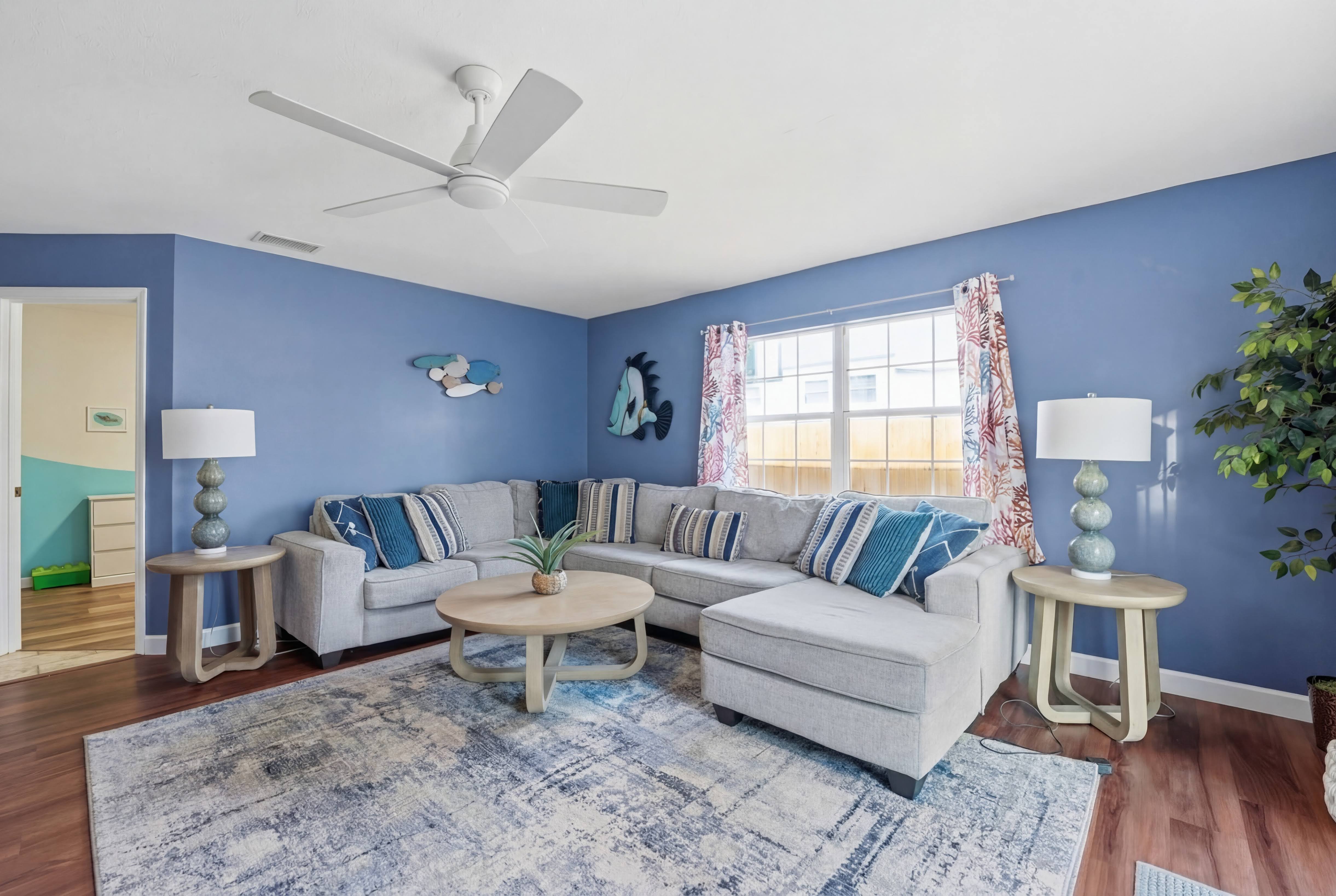 KEY FEATURES: ☀ Heated pool w/waterfall + hot tub + fancy foam pool floats + pool noodles + kids life jackets ☀ Pickle ball 20' x 44' court + basketball court + fire pit + grill (BYO charcoal) ☀ Cornhole + ladder game + giant yard pong + gazebo + twinkle lights ☀ 6 beach chairs + 2 beach umbrellas + small backpack cooler for beach trips ☀ Game room with old-school Nintendo gaming system + shuffleboard table + board games + drink fridge ☀ Large primary bedroom w/luxurious King bed + pullout couch/seating + Roku TV + en-suite bathroom ☀ Dining room seats 8 comfortably ☀ Extra large kitchen + island seating + Keurig + coffee pods + kitchen basics ☀ Family room w/65" Roku TV + soundbar ☀ Spacious 2,200+ sq ft home for large groups ☀ Family friendly items: sound machines in every bedroom + high chair + pack 'n play + scooters + some toys for little ones + kid-friendly cups and plates *Please note that the pickle ball court will be painted in the near future but is not painted yet*