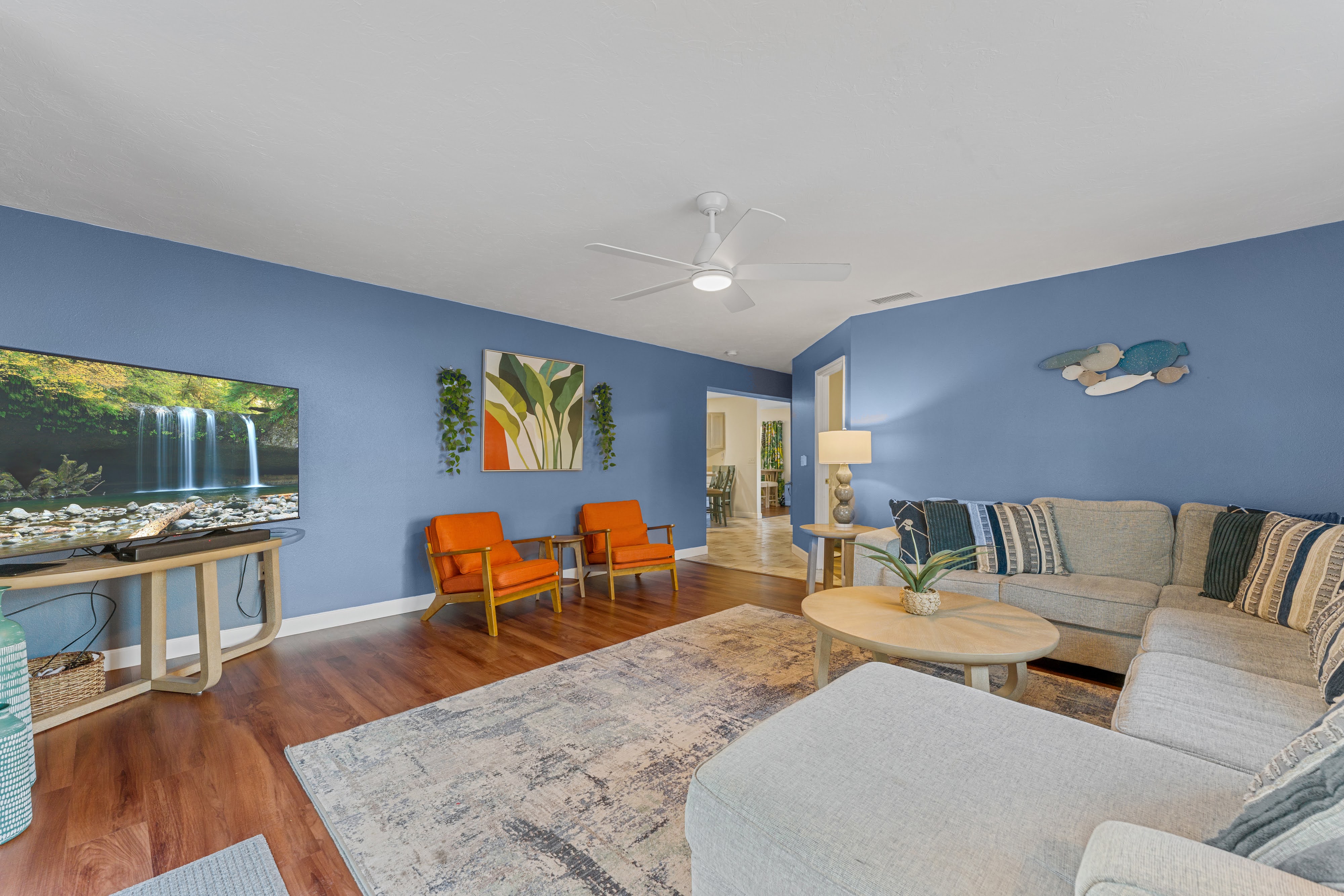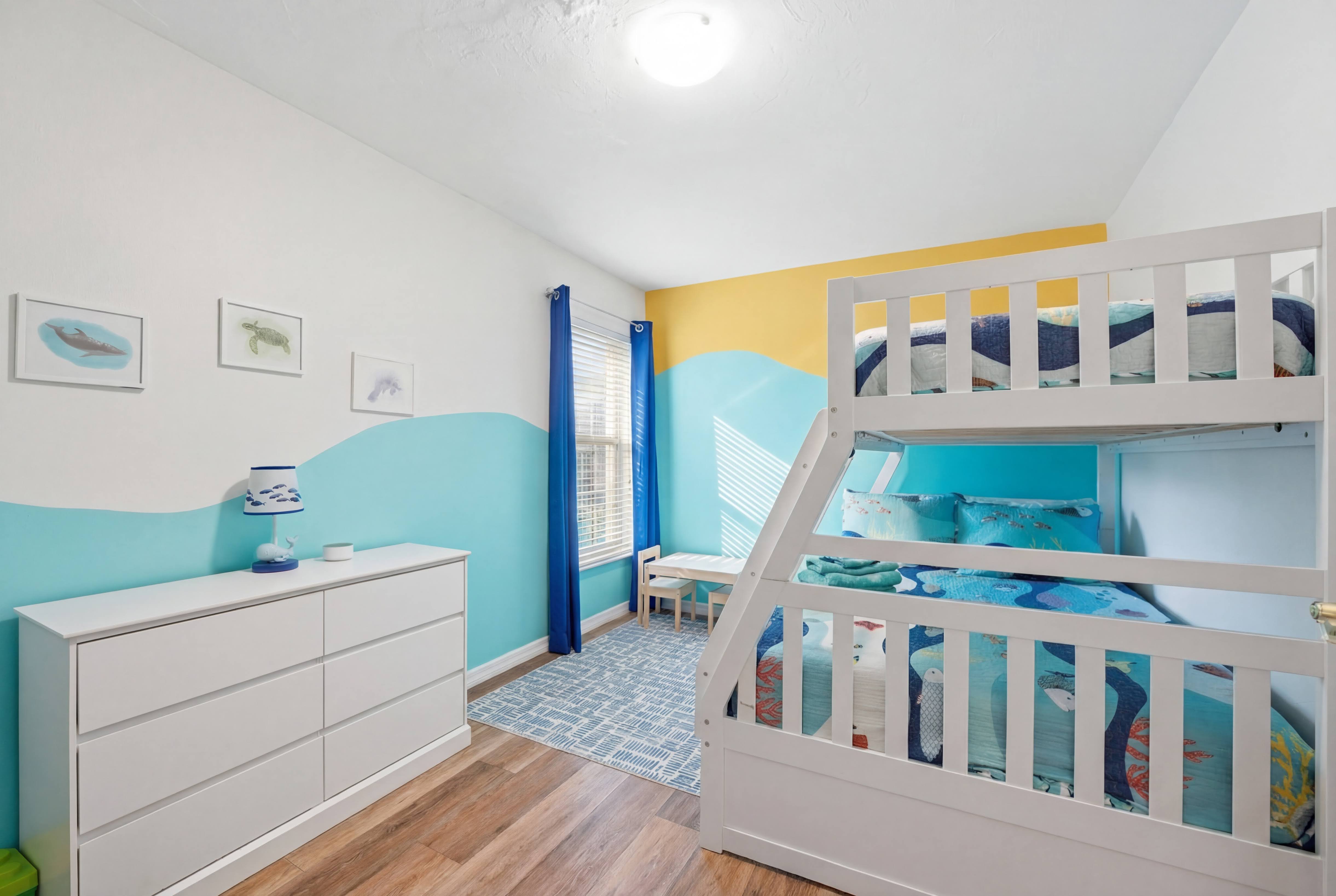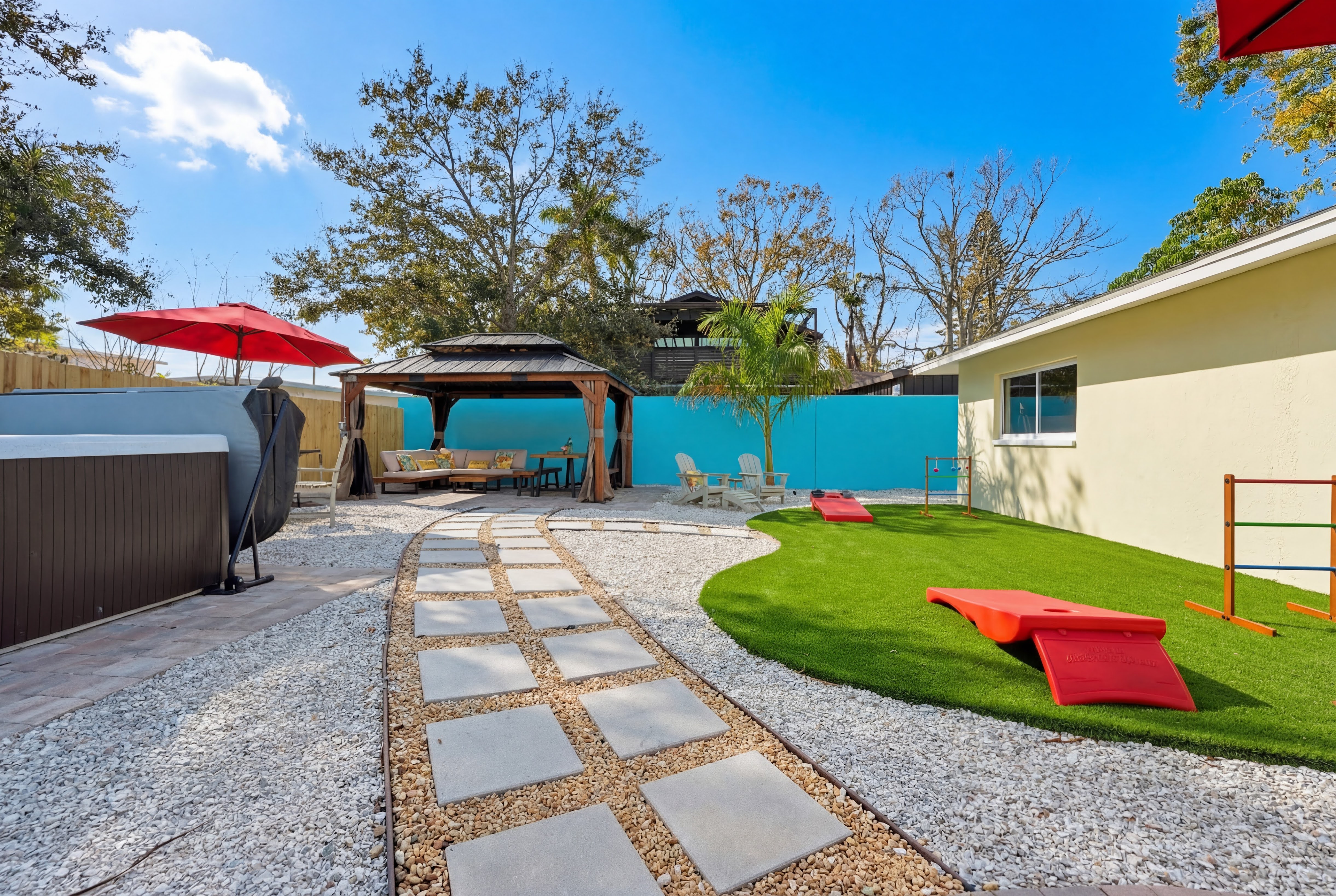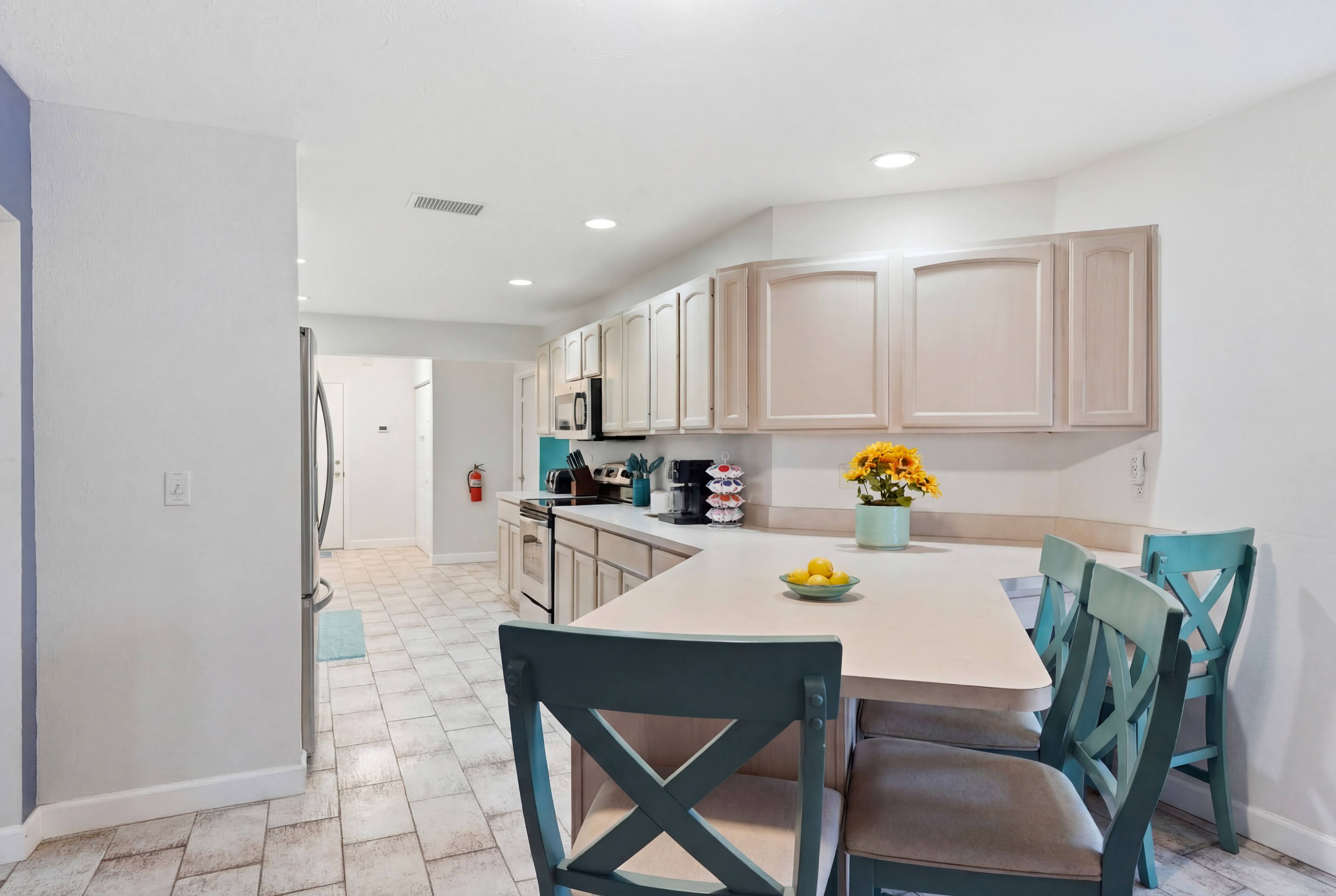 KEY FEATURES: ☀ Heated pool w/waterfall + hot tub + fancy foam pool floats + pool noodles + kids life jackets ☀ Pickle ball 20' x 44' court + basketball court + fire pit + grill (BYO charcoal) ☀ Cornhole + ladder game + giant yard pong + gazebo + twinkle lights ☀ 6 beach chairs + 2 beach umbrellas + small backpack cooler for beach trips ☀ Game room with old-school Nintendo gaming system + shuffleboard table + board games + drink fridge ☀ Large primary bedroom w/luxurious King bed + pullout couch/seating + Roku TV + en-suite bathroom ☀ Dining room seats 8 comfortably ☀ Extra large kitchen + island seating + Keurig + coffee pods + kitchen basics ☀ Family room w/65" Roku TV + soundbar ☀ Spacious 2,200+ sq ft home for large groups ☀ Family friendly items: sound machines in every bedroom + high chair + pack 'n play + scooters + some toys for little ones + kid-friendly cups and plates *Please note that the pickle ball court will be painted in the near future but is not painted yet*
